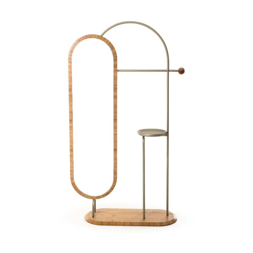 O espelho Grego é uma peça de presença marcante, que combina linhas curvas, base orgânica em madeira e estrutura metálica delicada. Assinado pelo designer Lucas Pasterchak, ele funciona como um elemento escultórico no ambiente, oferecendo não apenas reflexão, mas também personalidade, leveza visual e sofisticação. Ideal para halls, quartos e espaços que valorizam peças com identidade.
