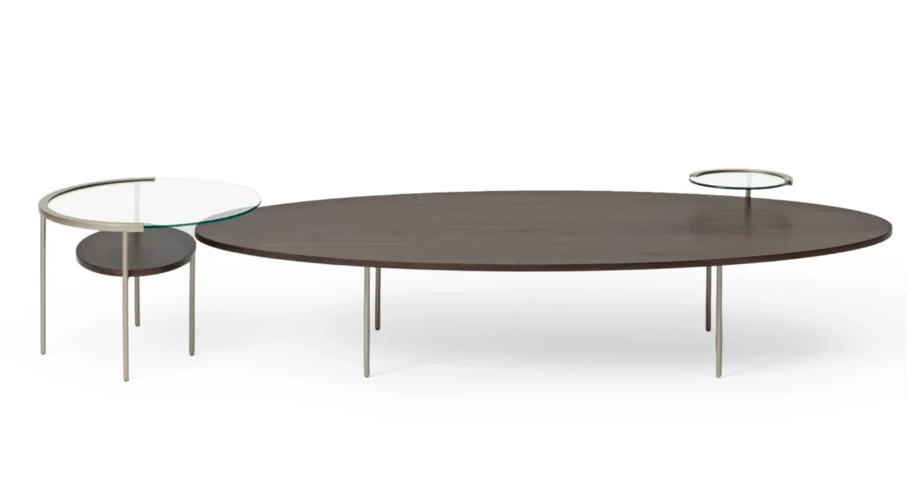 A Mesa de Centro Timbre está disponível em duas opções. A opção menor (A) apresenta um tampo de vidro, acompanhado de uma estrutura metálica e uma prateleira de MDF laqueado ou laminado. Já a mesa (B) possui uma estrutura em aço carbono, com tampo revestido em lâmina de madeira natural ou MDF laqueado, e um vidro sobreposto ao tampo, que é envolto por uma estrutura metálica.
