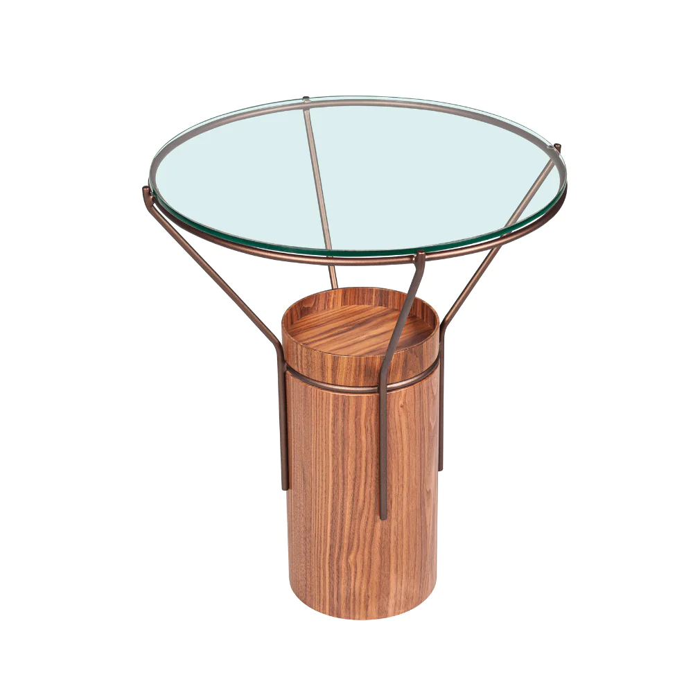 A mesa lateral Tulipa destaca-se pelo equilíbrio entre materiais e formas. Seu tampo em vidro incolor revela o desenho fluido da estrutura metálica, que se une com elegância ao pé central revestido em lâmina natural. Um design contemporâneo que alia transparência, textura e proporção de forma harmônica, ideal para composições refinadas e ambientes acolhedores.