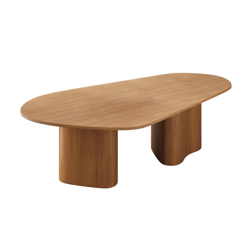A mesa de jantar Maly apresenta curvas suaves e um tampo amplo, combinado a bases robustas de linhas arredondadas que conferem equilíbrio visual e presença marcante ao ambiente. Seu formato orgânico favorece a circulação e cria uma atmosfera leve e contemporânea para salas de jantar de diferentes estilos.
