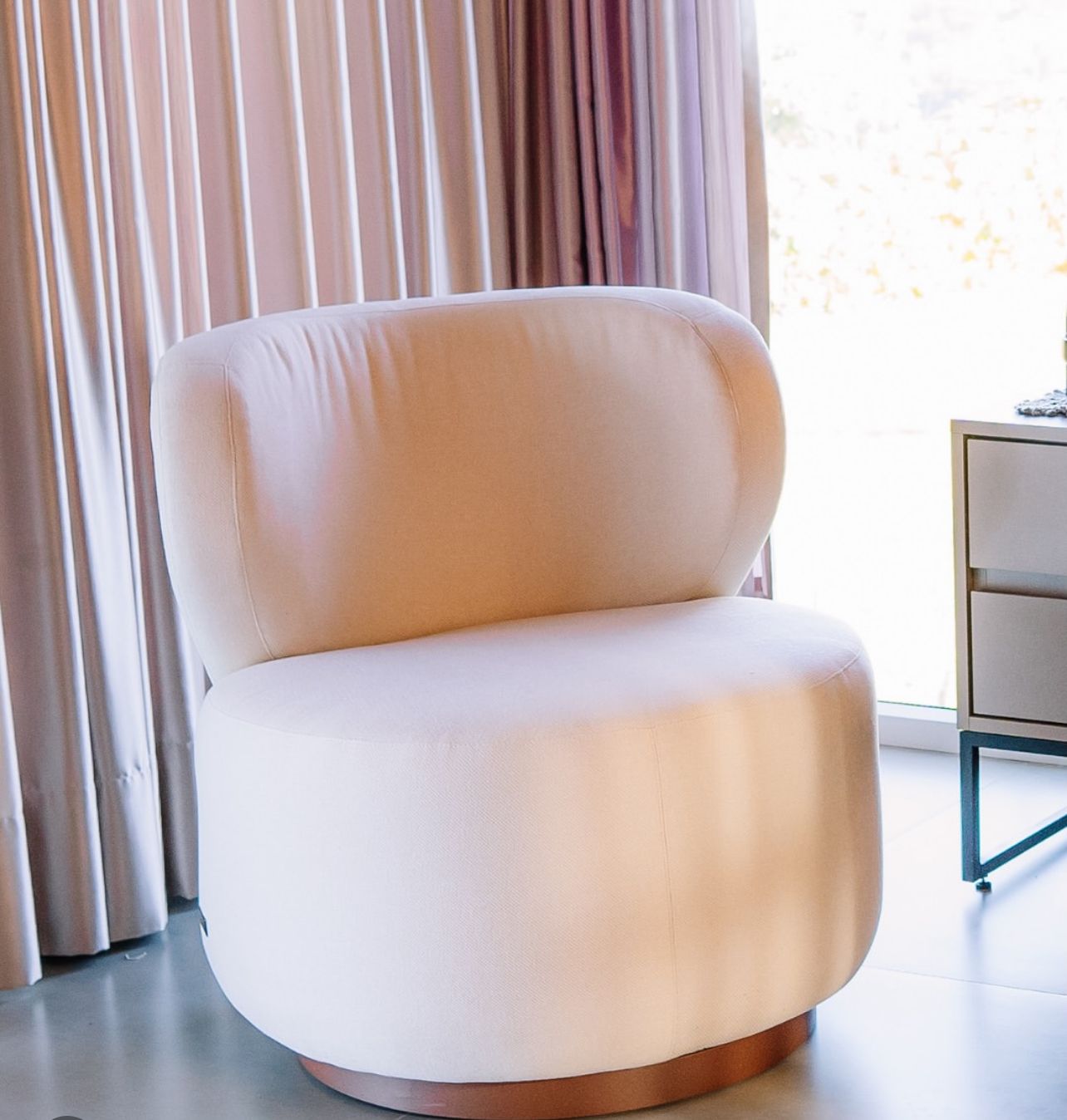 A poltrona Carú possui traços arredondados, base giratória e um detalhe marcante em madeira laminada no encosto.