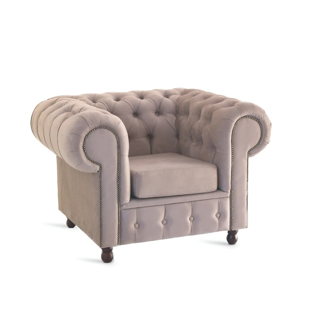A Poltrona Maite é inspirada no tradicional estilo Chesterfield, com capitonê sofisticado e detalhes em tachas metálicas que ressaltam sua elegância atemporal. Uma peça imponente, que une o charme retrô ao conforto moderno, tornando-se o destaque de qualquer ambiente.