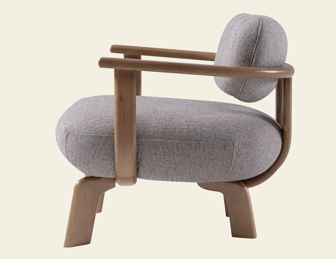 O design é marcado por linhas orgânicas e minimalistas, com um toque escandinavo ou de design biofílico, onde as formas arredondadas do estofamento contrastam com a linearidade dos braços de madeira. O encosto tem um formato que se assemelha a um rolo, oferecendo um suporte adicional.