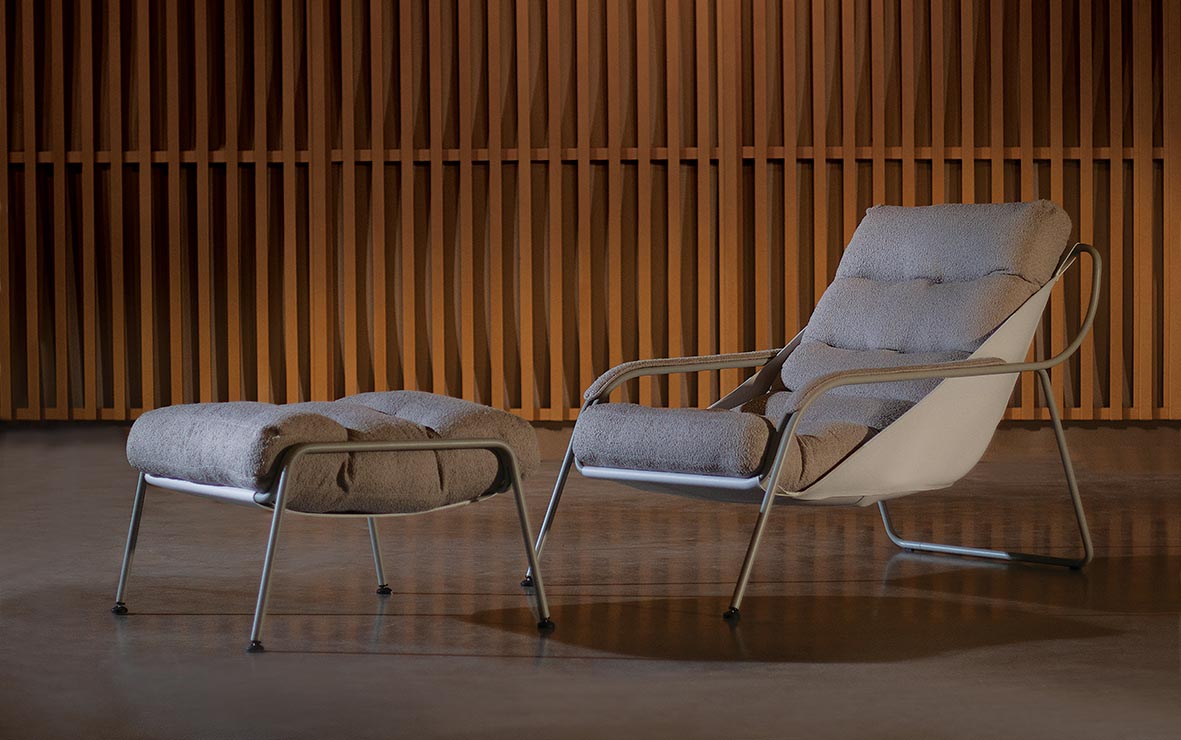 A Poltrona Maggiolina com Puff traz em seu design a união ideal entre o clássico e contemporâneo. Sua estrutura é feita em metal com pintura epóxi, enchimento do assento e encosto em pluma siliconada.